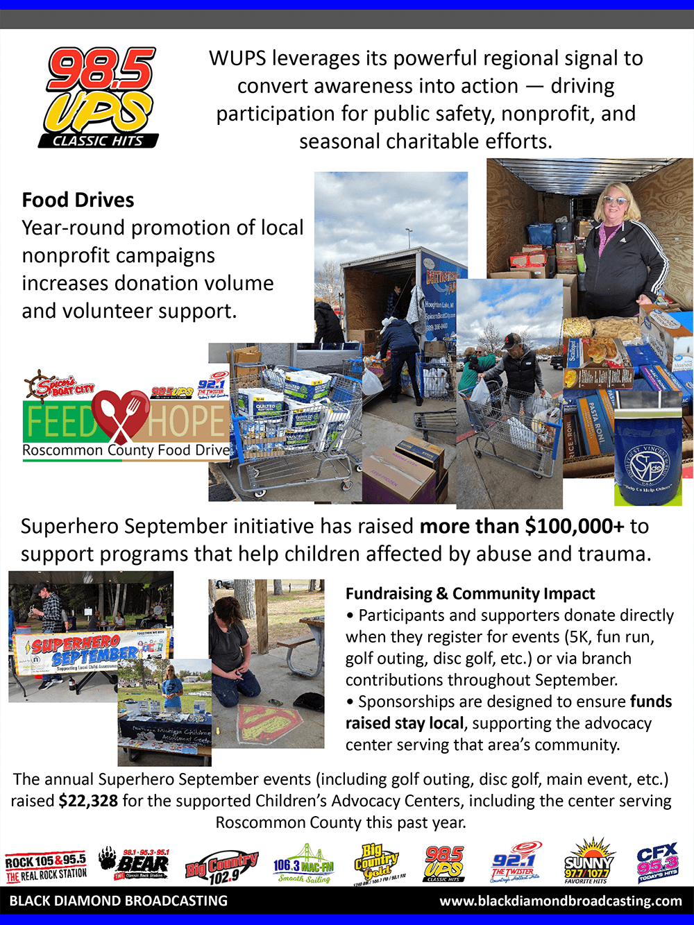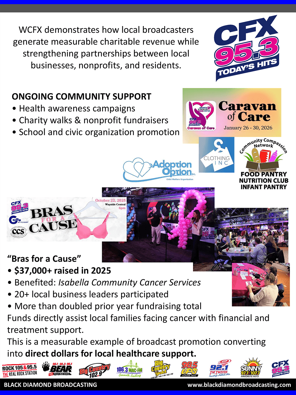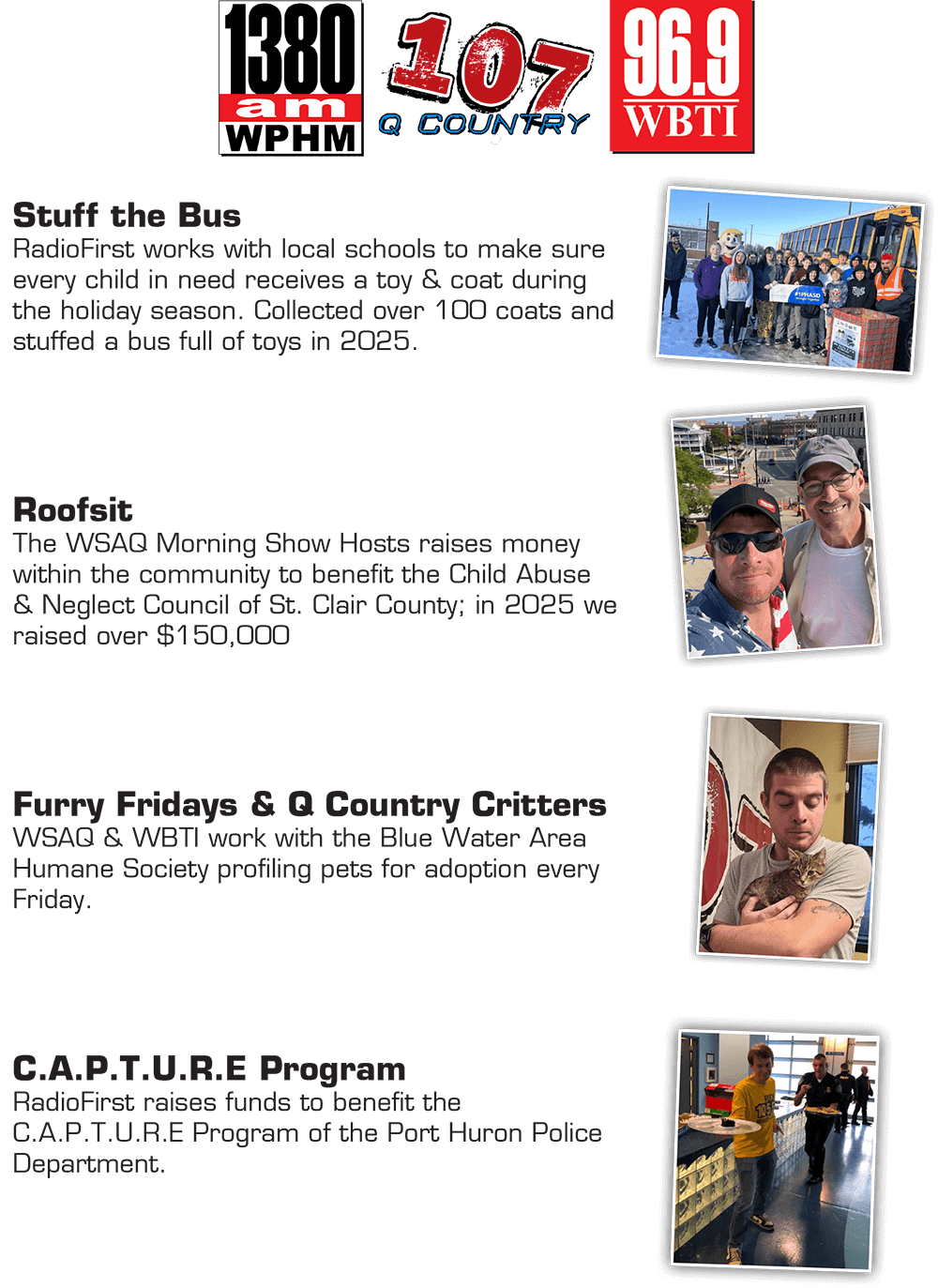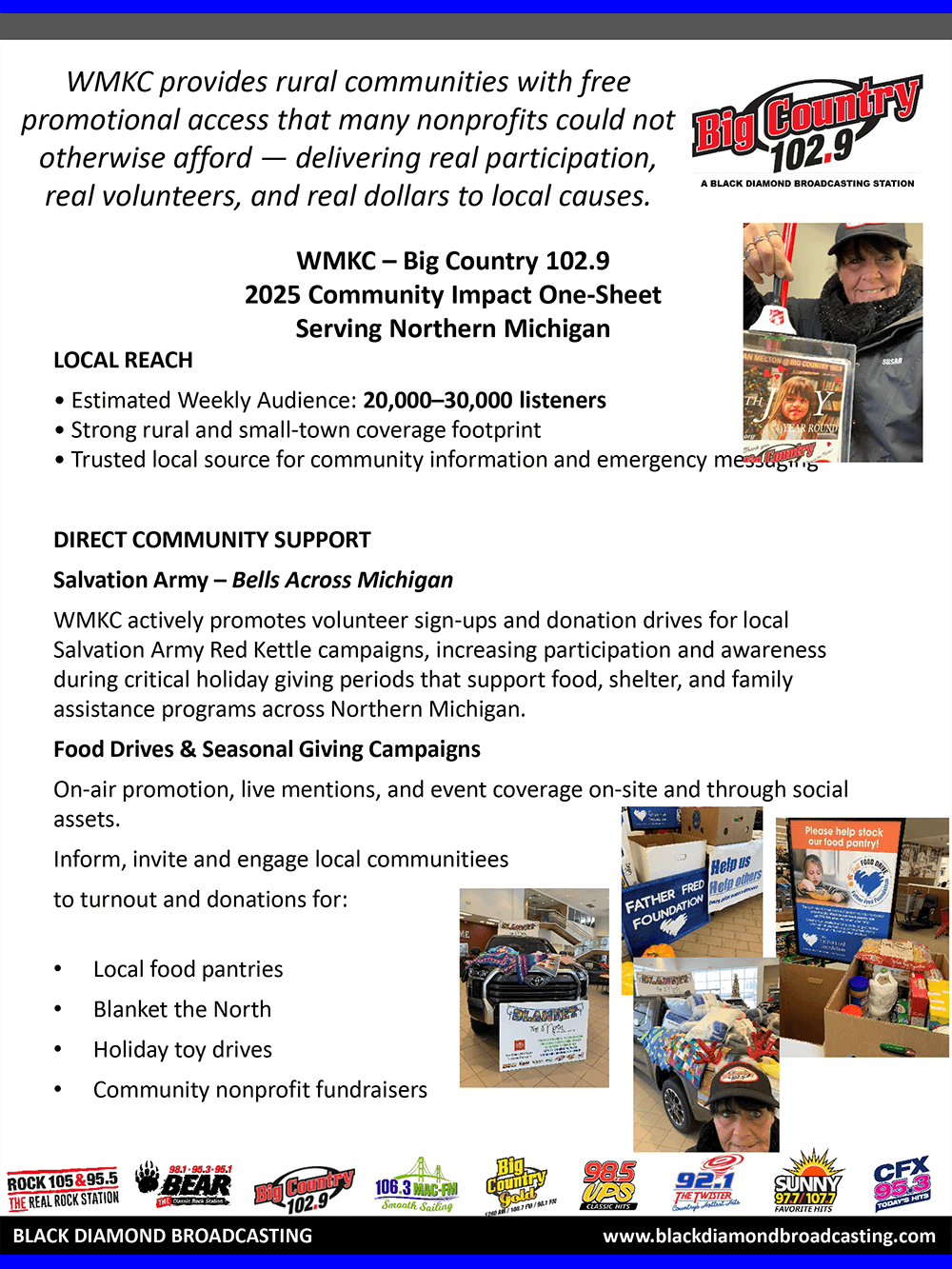 In 2025, we expanded our Make an Impact initiative, partnering with nine local nonprofits - using our on-air, digital and social platforms. These efforts raised more than $150,000 and collected tens of thousands of physical donations, all reinvested back into Mid-Michigan communities. Featured partners included Sleep in Heavenly Peace (beds for children), Champions of the Heart (CPR & AED education), Mitten Misfits Farm Sanctuary (providing forever homes for rescue animals), Footprints of Michigan (footwear for children and veterans), Big Brothers Big Sisters (youth mentorship), Ele’s Place (grief support for children), and It’s A Breast Thing (support for breast cancer patients). Our Toys for Tots drive collected over $20,000 in toys for the local Salvation Army.